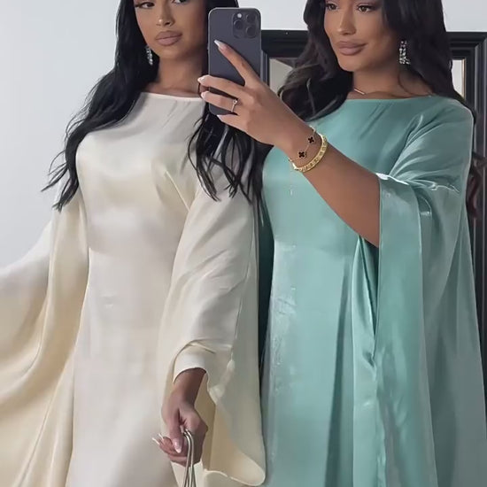 Featuring dramatic batwing sleeves and a minimalist neckline, this abaya creates an airy, flowing look that moves effortlessly with every step. The lightweight fabric provides comfort while maintaining a polished, high-end appearance — perfect for special occasions, evenings out, Eid, weddings, or elevated everyday wear.